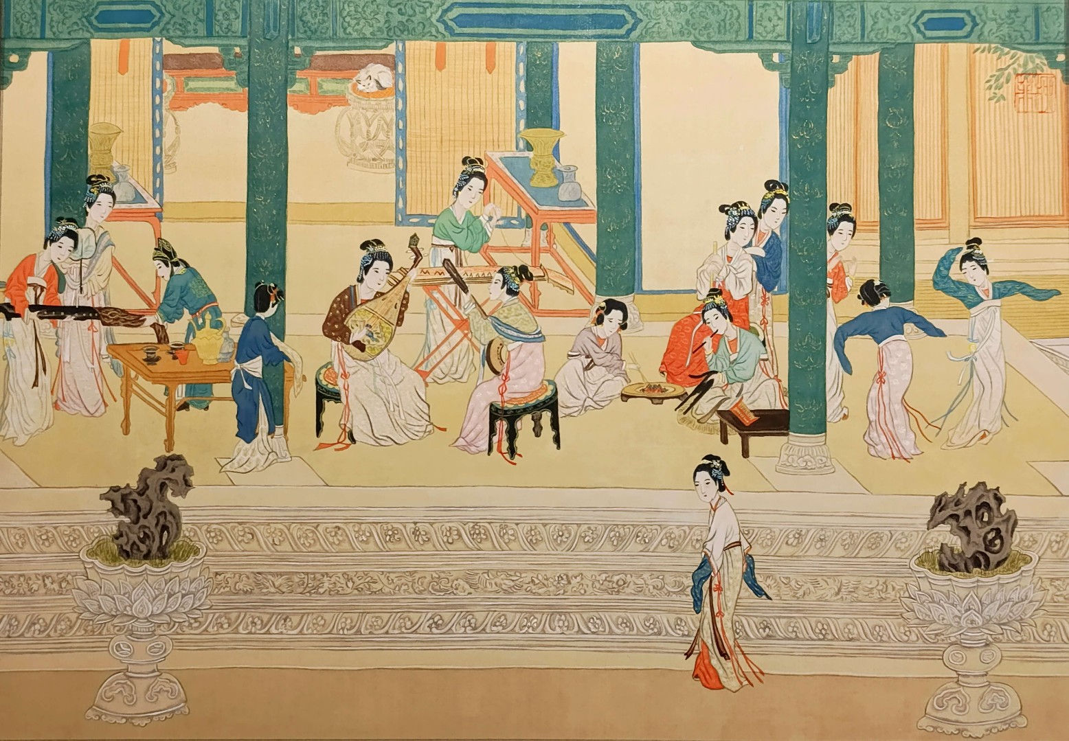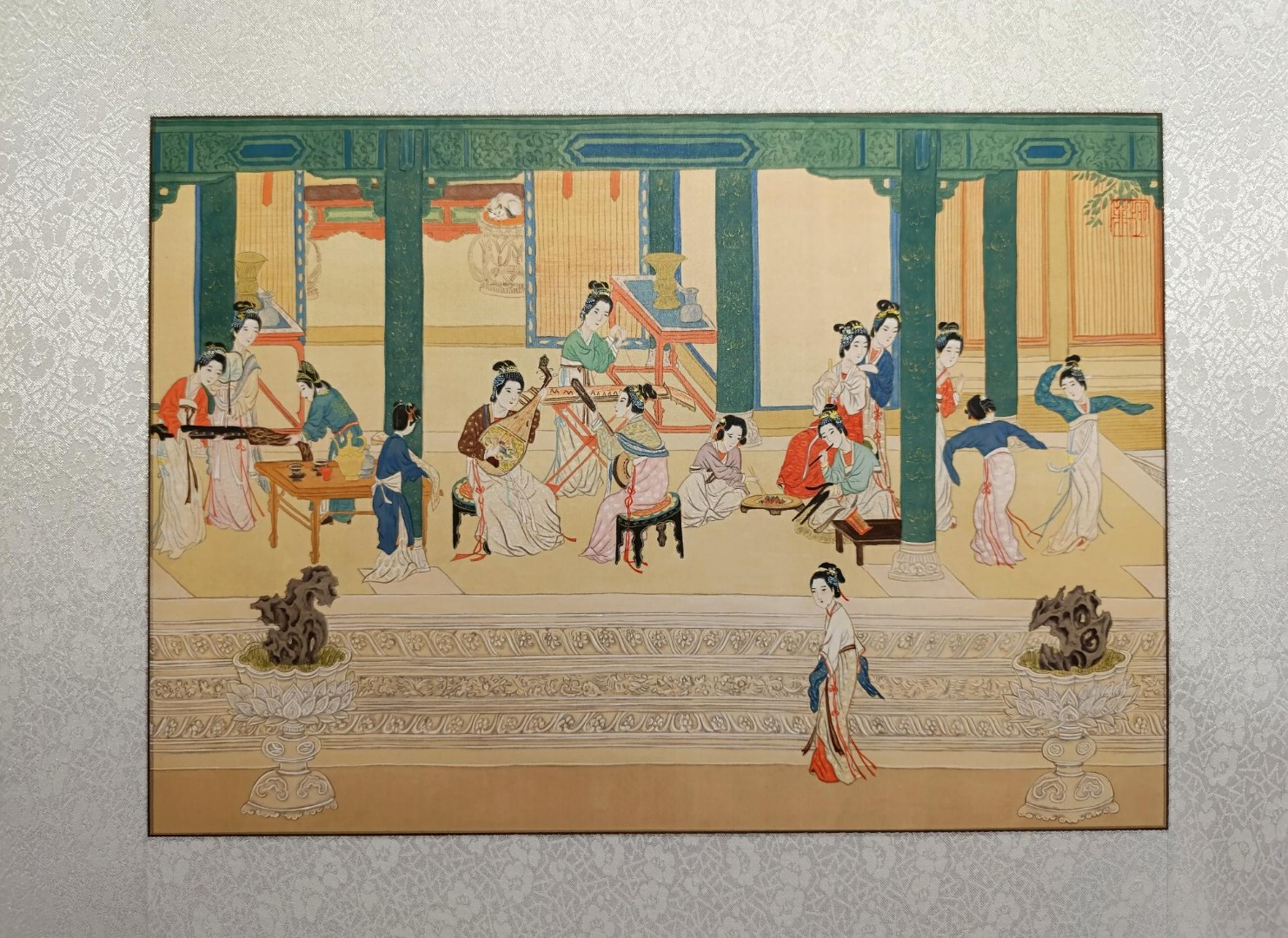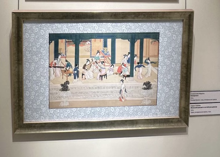 Копия фрагмента свитка Цю Ина, династия Мин (1368-1644). Одежды, украшения и некоторые предметы интерьера выполнены по образцам моды династий Тан (619-907) и Сун (960 - 1279). Шелк, минеральные краски, тушь. С 25.12.2025 по 25.01.26 картина представлена на выставке "100 пионов" в рамках Седьмого Фестиваля китайской живописи, проходящего в Музее Востока в Москве.